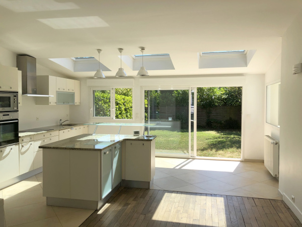 Proche du centre ville, dans une petite voie piétonne, Maison de 134 m² (109 m² en loi bouttin), avec jardin se composant: d'une entrée, un séjour salle à manger, une cuisine séparée, quatre chambres, un bureau, une salle de bains avec wc, une salle de douches avec wc, un wc séparé, un dressing, un sous sol, une cave et un parking (sous sol rue des écoles)
