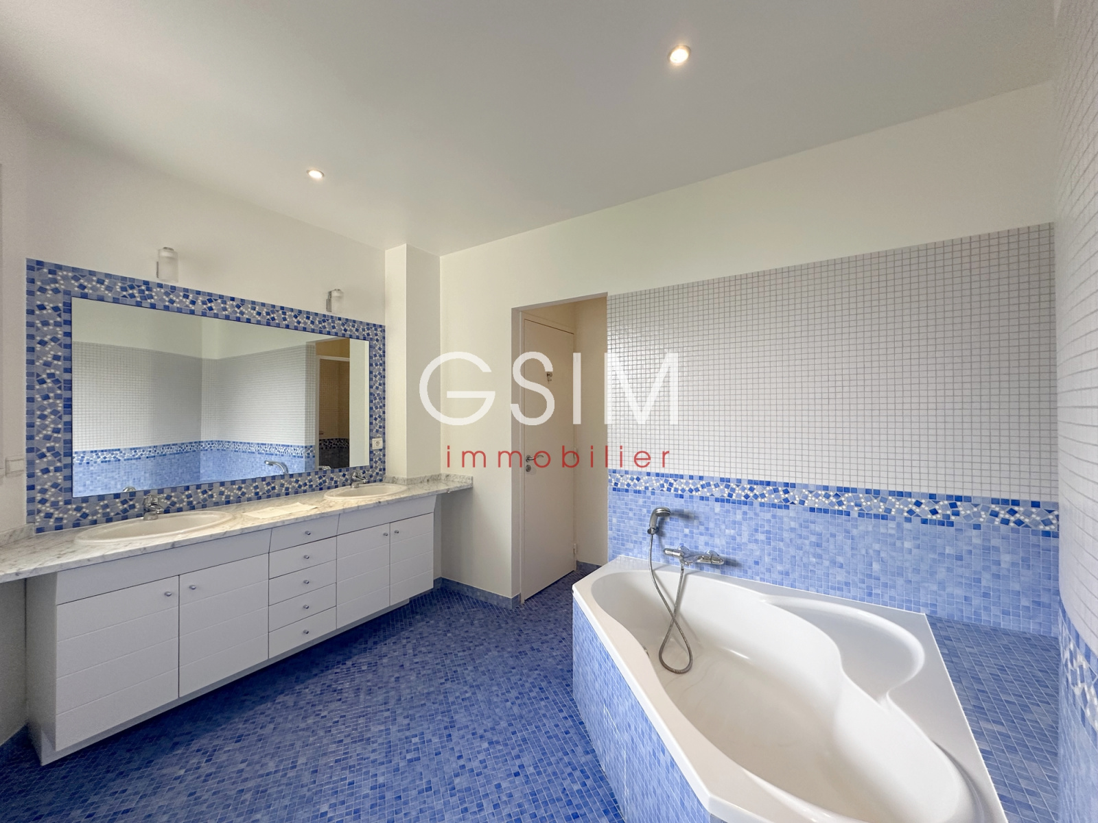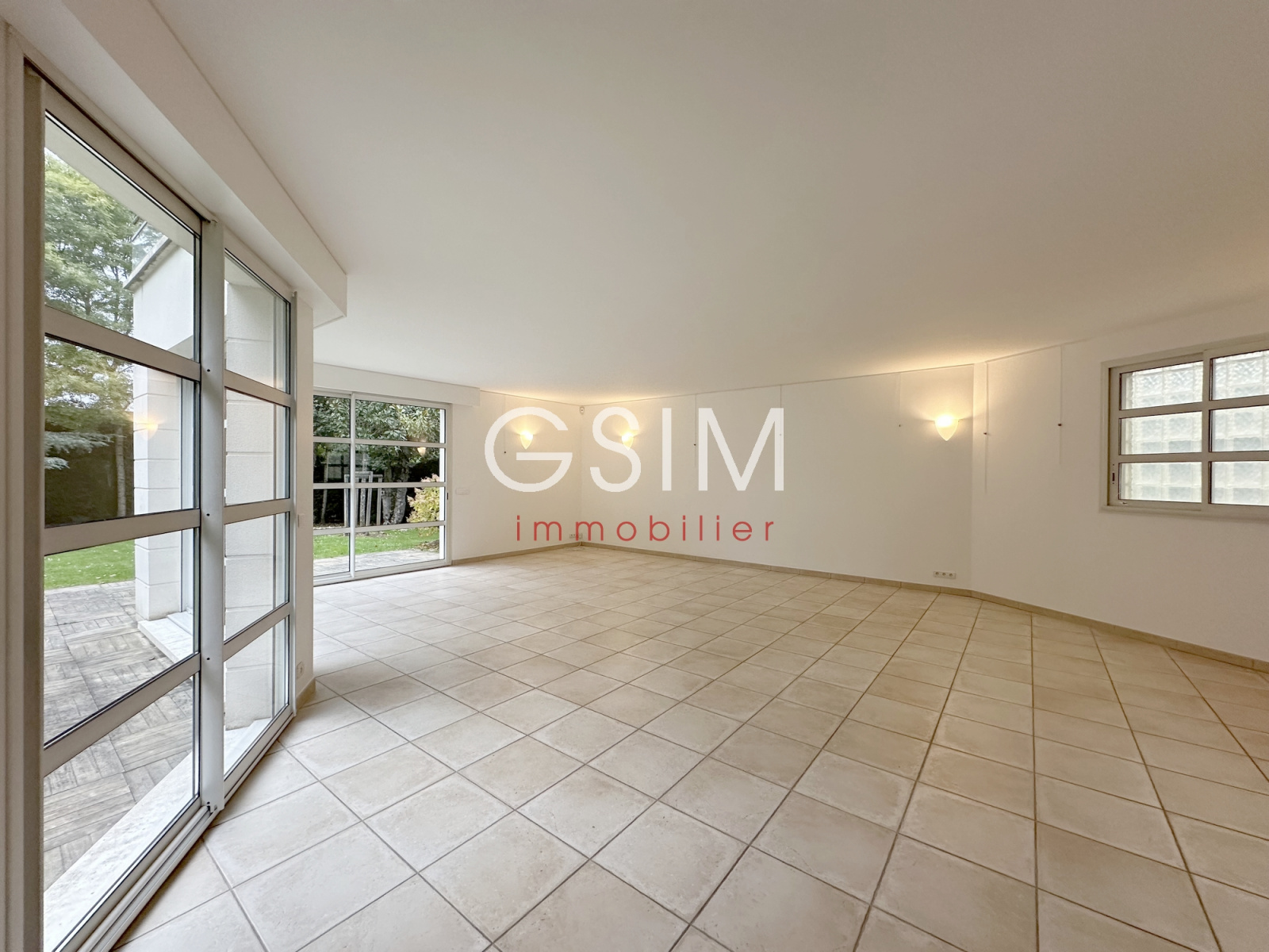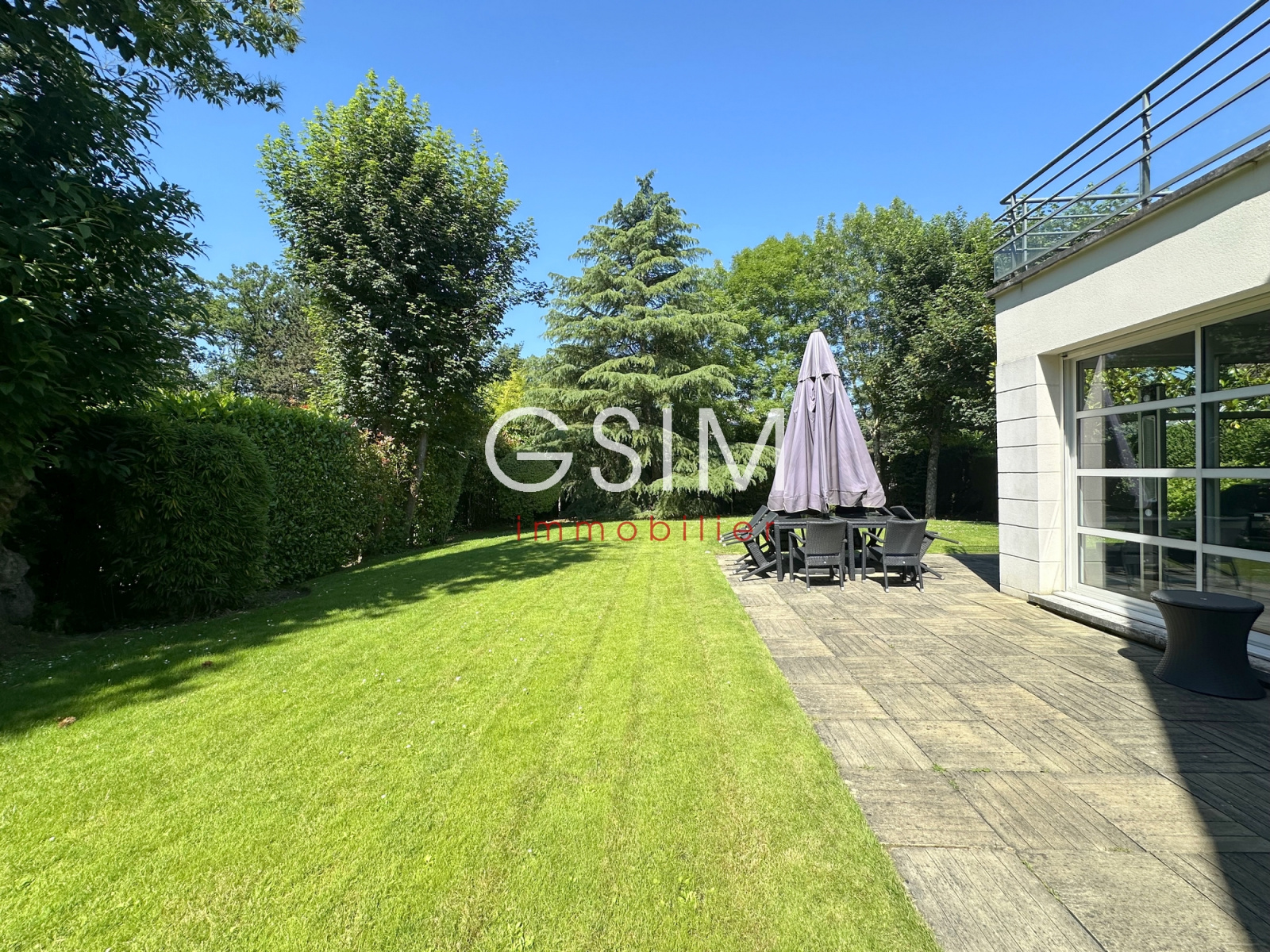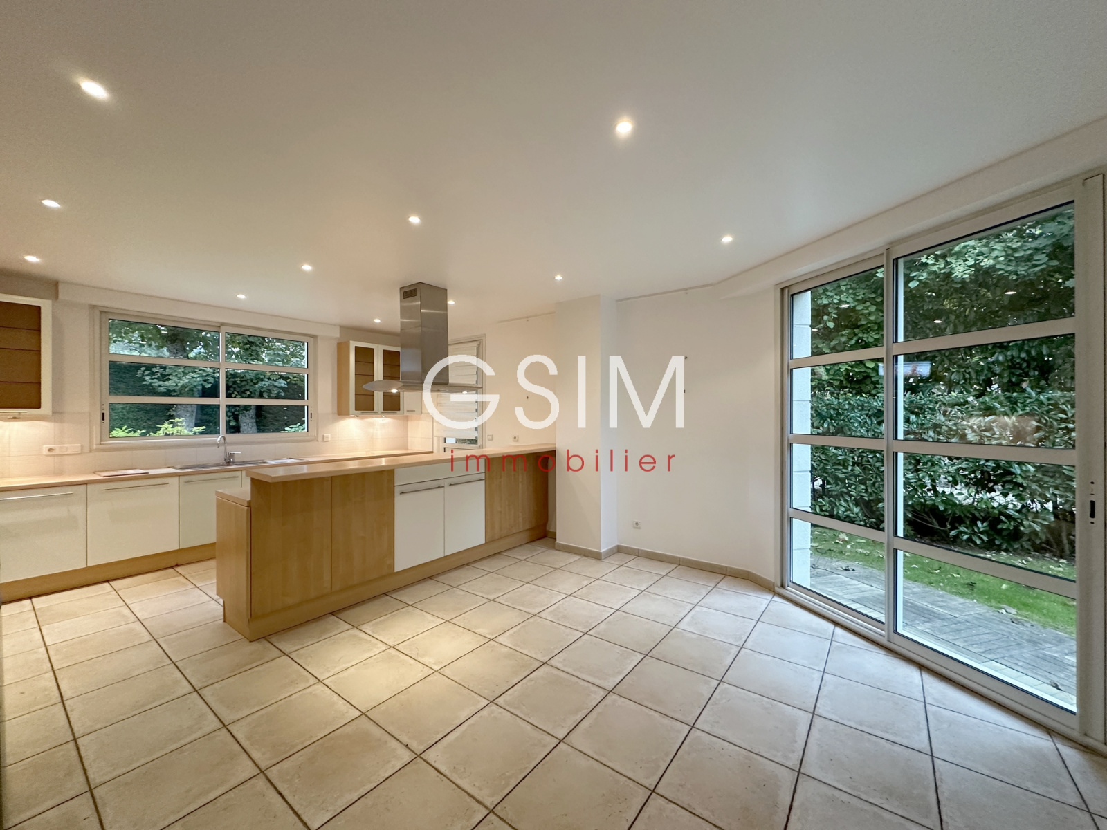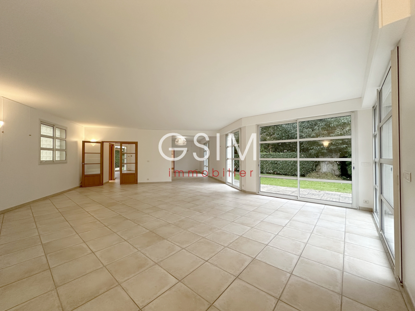 au rez de chaussée, d'une grande entrée cathédrale, d'un séjour double de 60 m2 sur terrasse, d'une salle à manger, d'une grande cuisine dinatoire équipée, d'une chambre avec salle de douches et wc privatifs, toutes les pièces avec grandes baies vitrées sur le jardin, d'un espace dressing-rangement avec wc séparé.