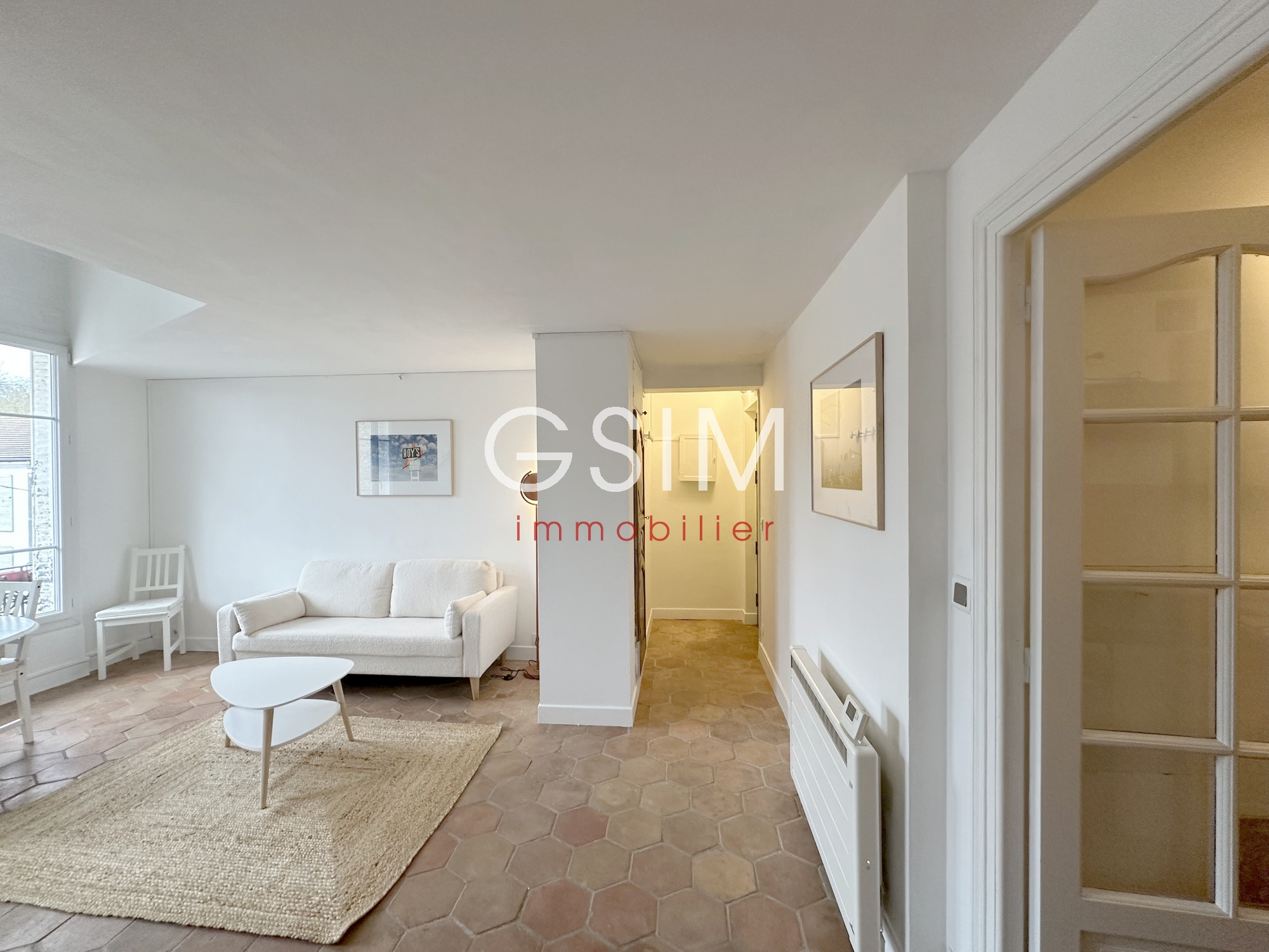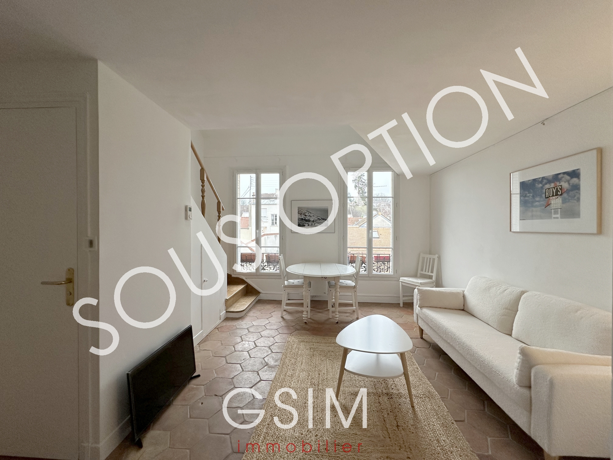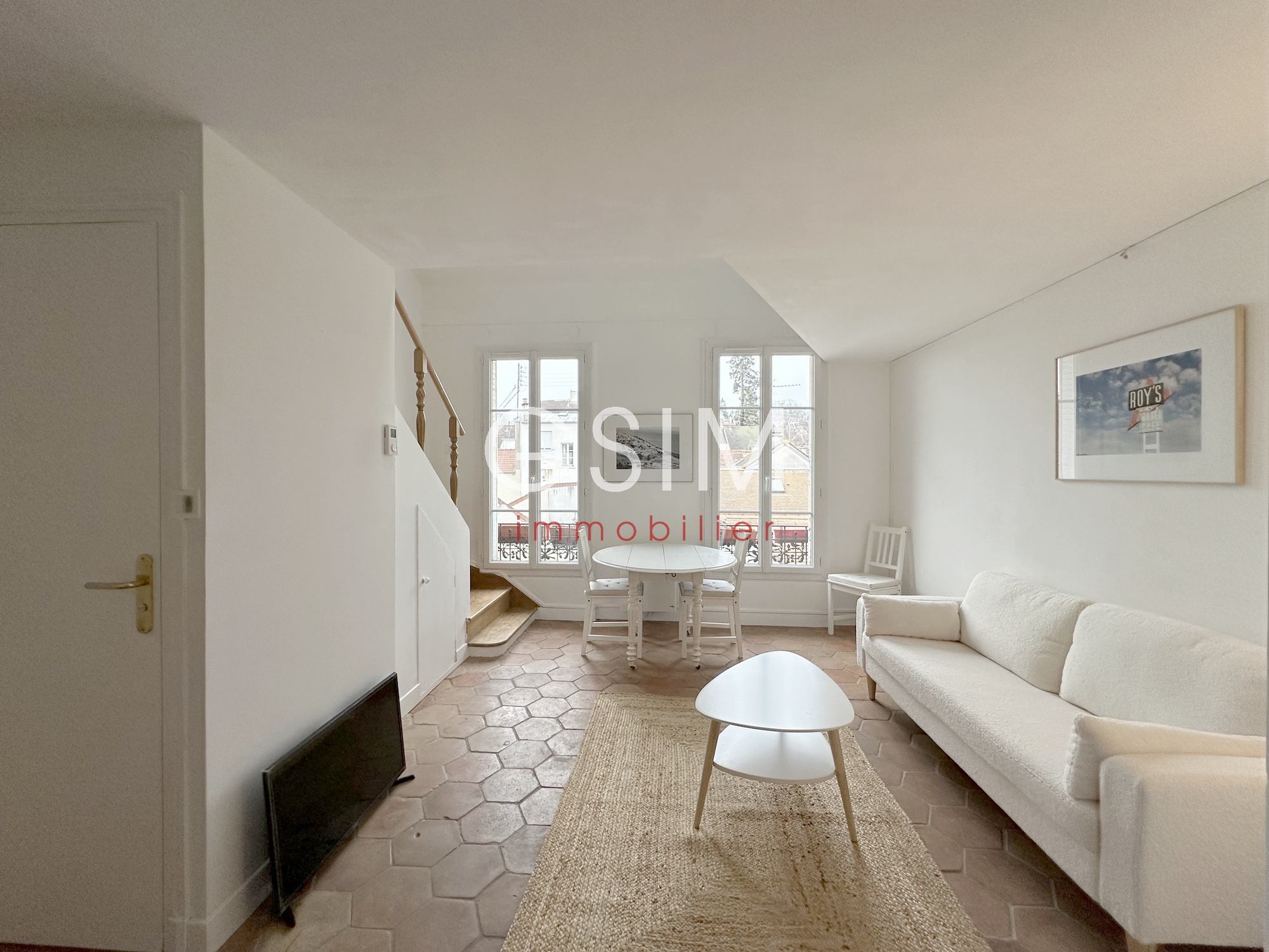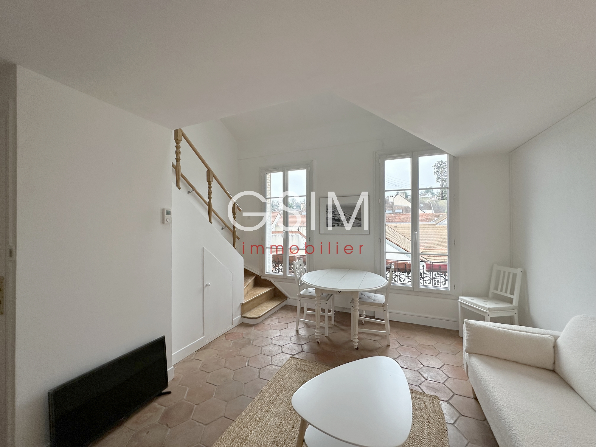 En plein coeur de Garches, à deux pas des commerces et non loin des transports, Duplex au dernier étage sans ascenseur d'un petit immeuble 1900, Meublé, de 32,51 m² (46,24 m² au total) se composant : d'un séjour, d'une cuisine séparée, d'une chambre, d'une salle de bains, d'un wc séparé, et d'une grande cave.