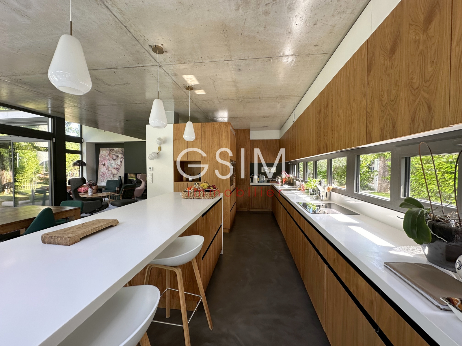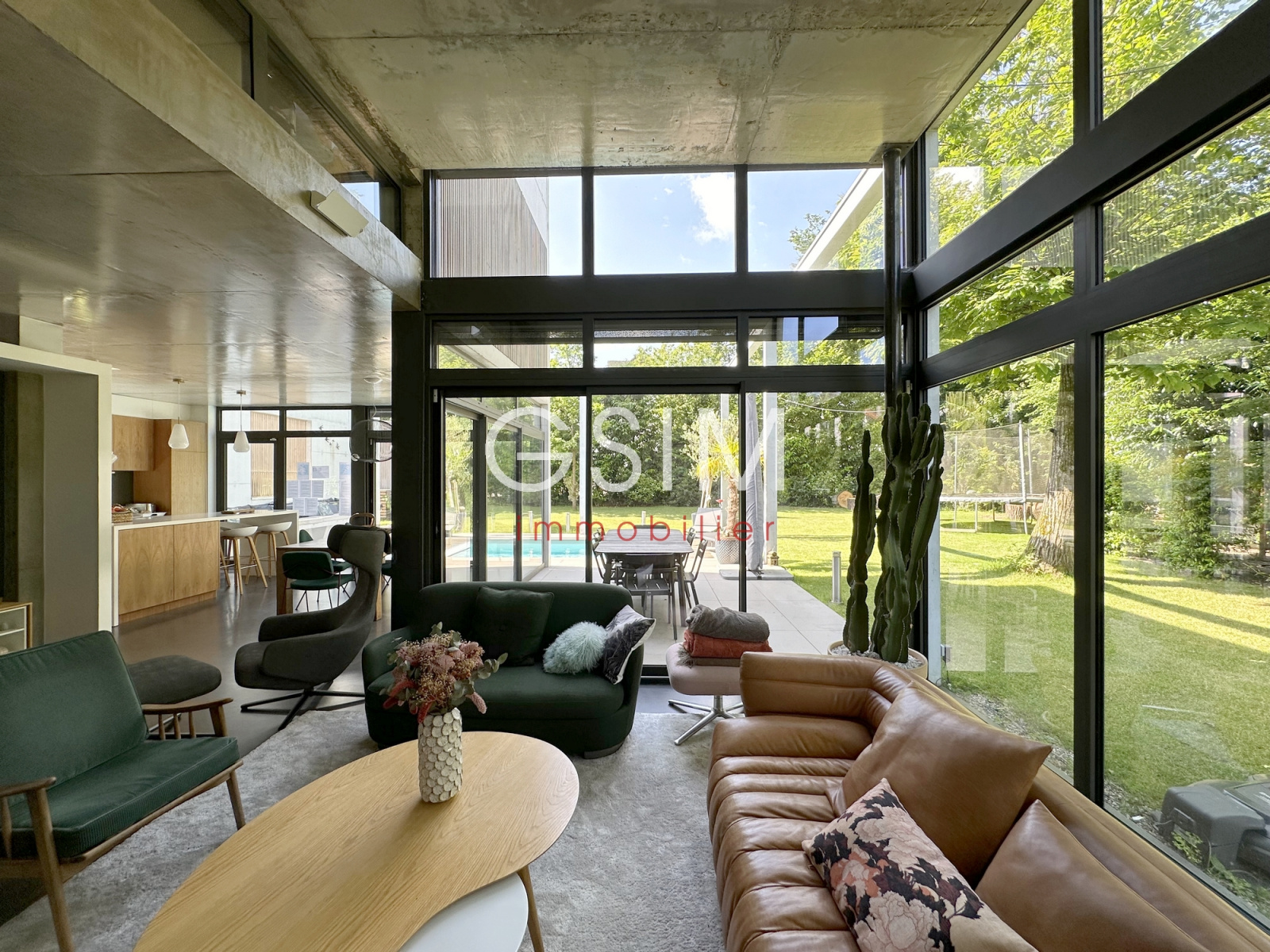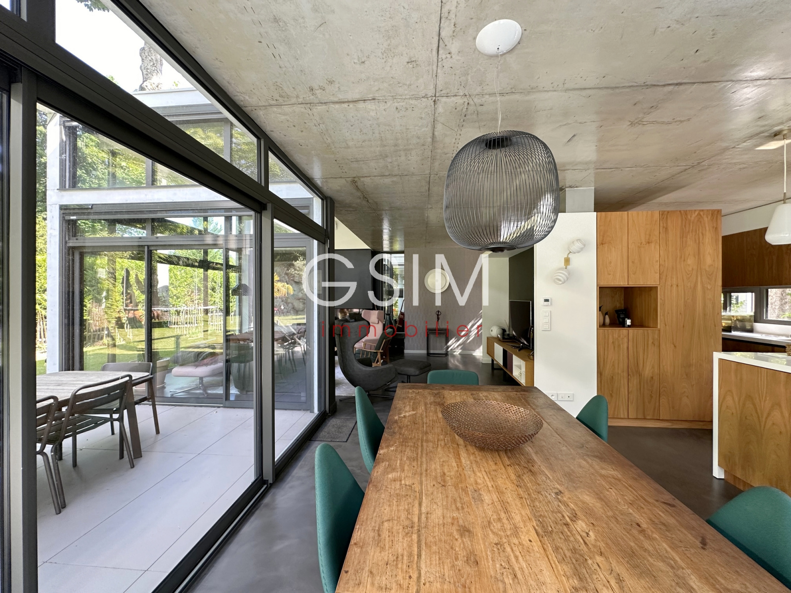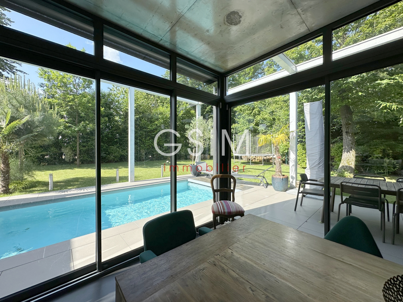 Au rez de chaussée, d'une entrée avec dressing, séjour double avec cheminée et grandes baies vitrées sur jardin, salle à manger et cuisine US équipée avec vue sur la piscine, d'un petit espace bureau, d'une suite parentale avec chambre, deux dressings, une salle de douches, et un wc.