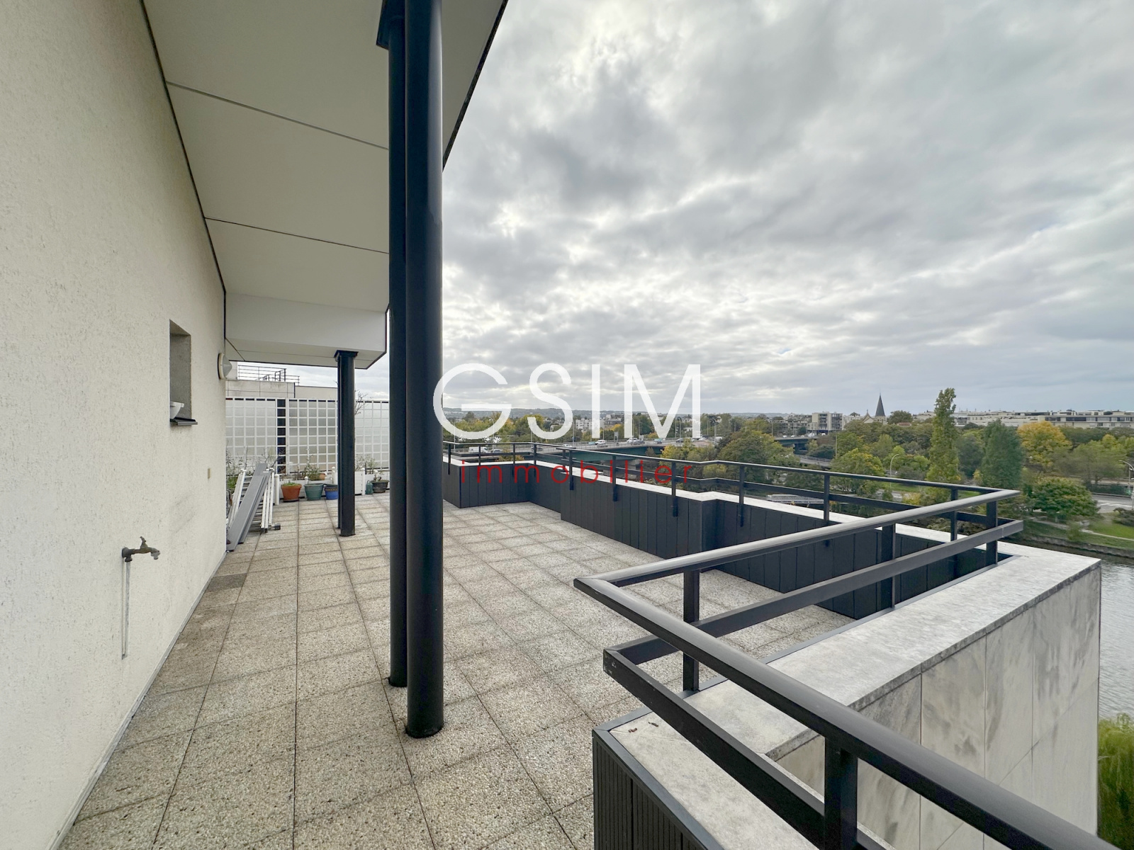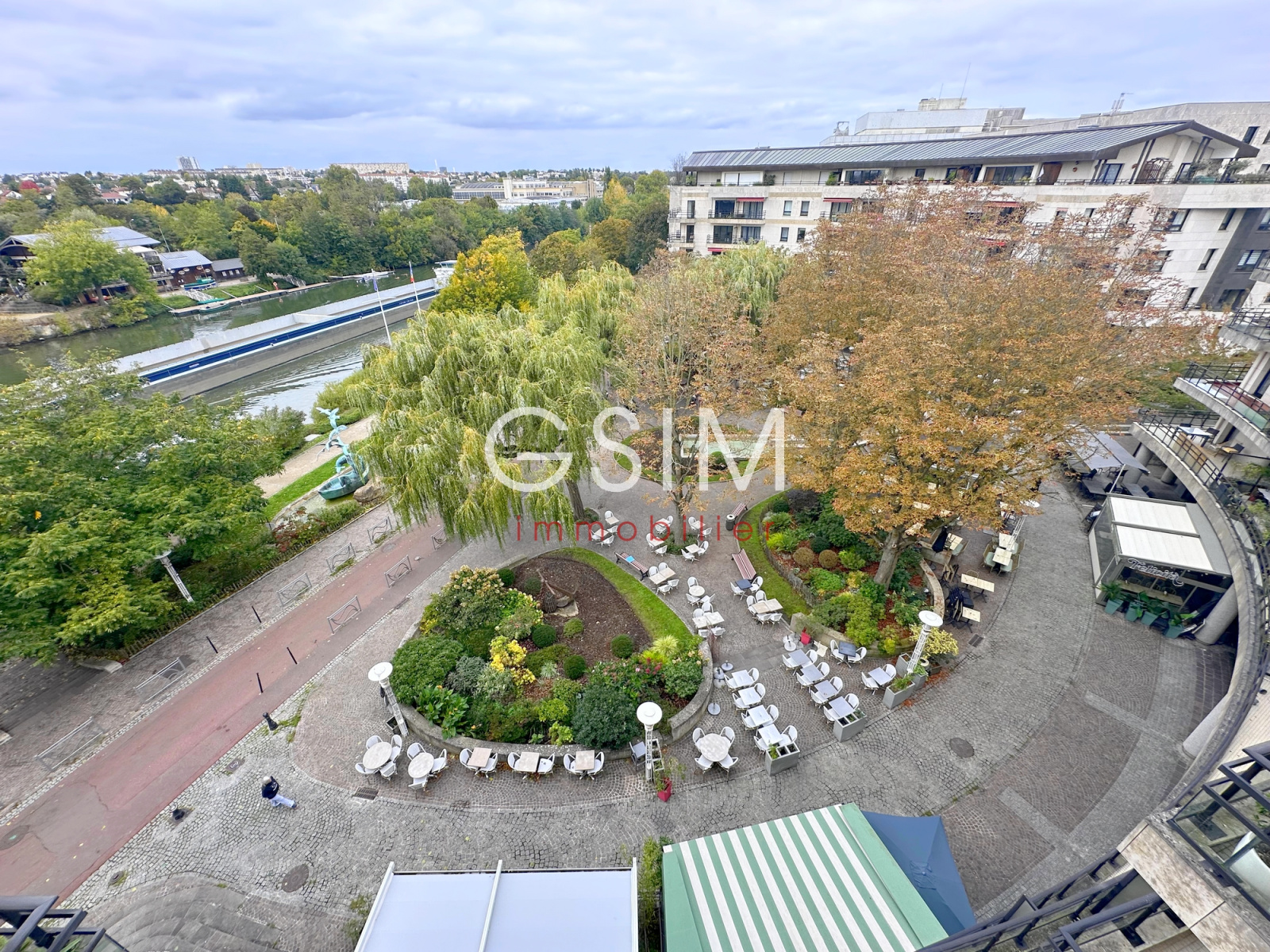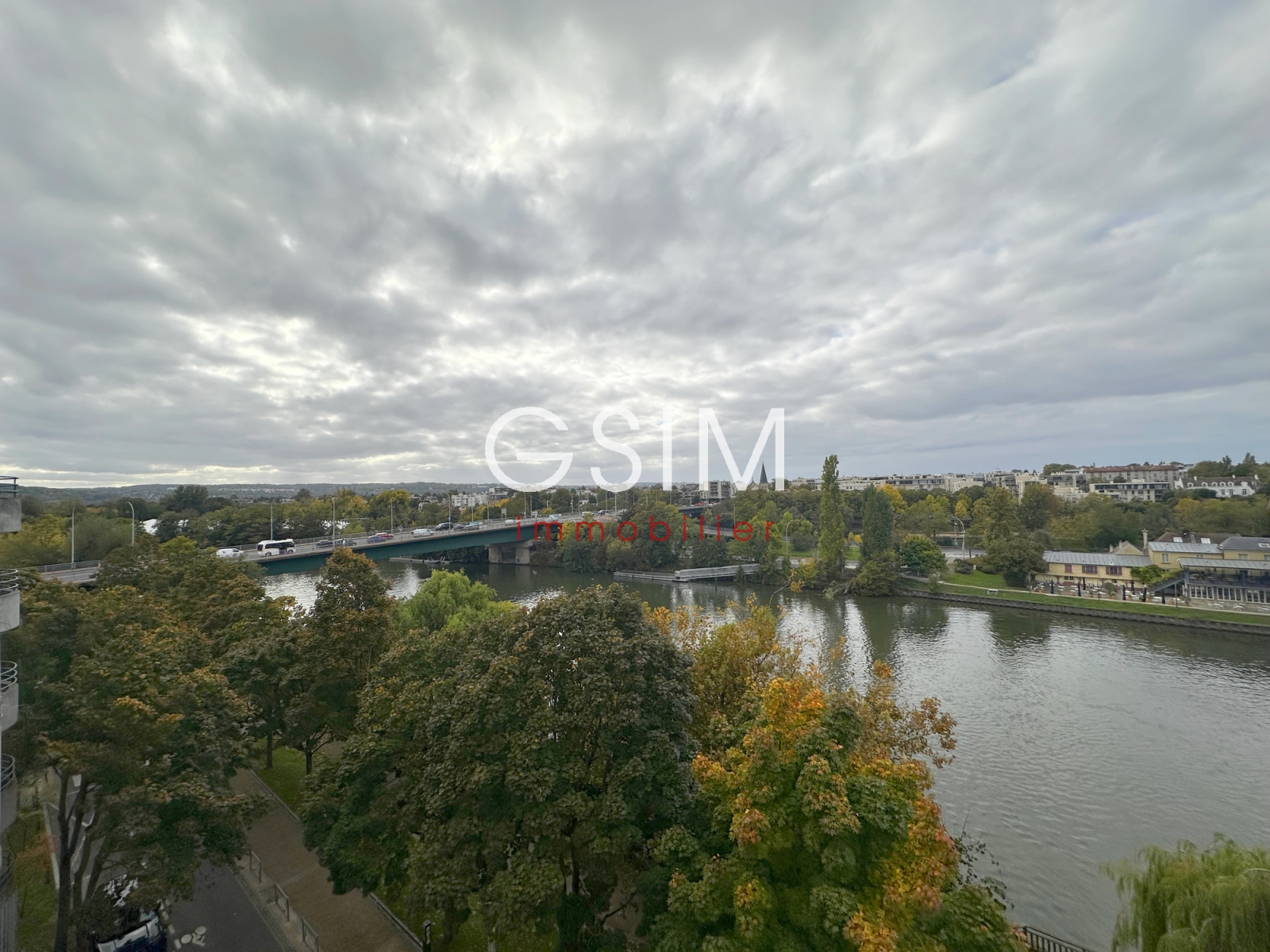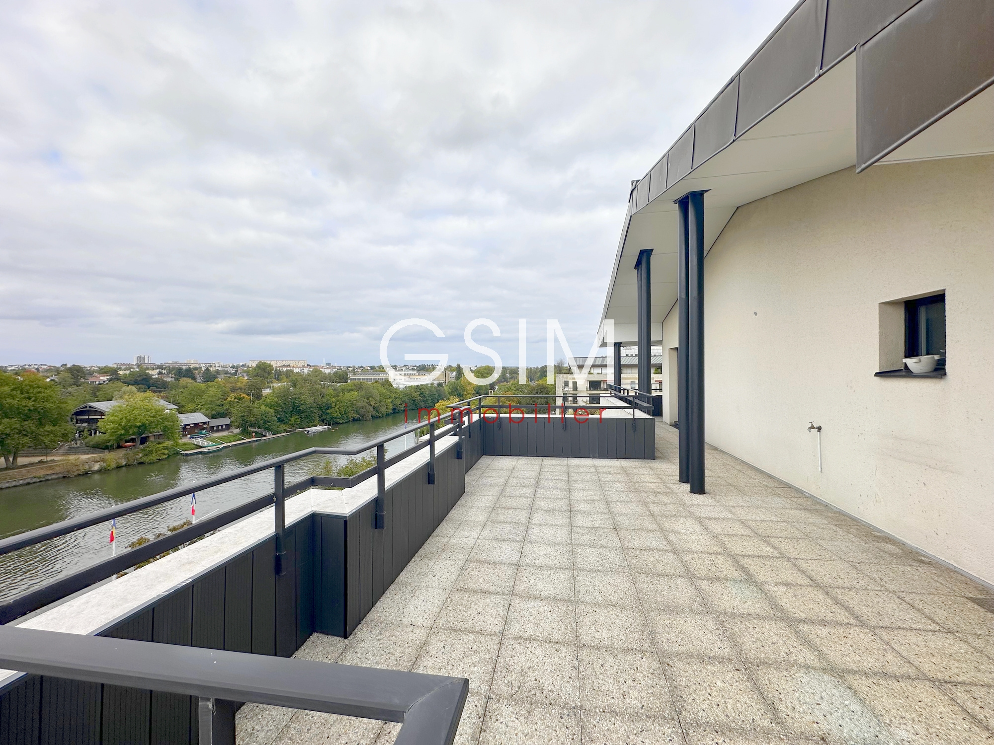 Place des Impressionnistes, au dernier étage avec Terrasses (vue sur la Seine, l'île des Impressionnistes, et le pont de Chatou), très bel appartement entièrement refait de 113 m² se composant : d'une entrée avec penderies, d'un séjour double de 43 m², d'une cuisine US équipée, d'une chambre avec salle de bains avec baignoire et douche, d'une chambre avec penderie et salle de douches, d'une troisième chambre avec salle de douches. Une cave et un parking sous-sol. Fibre.