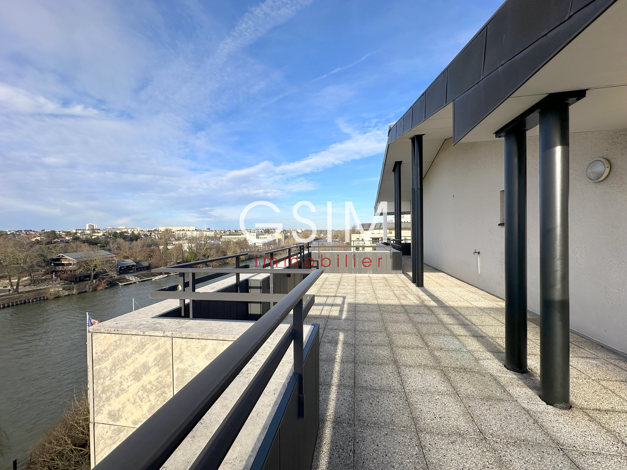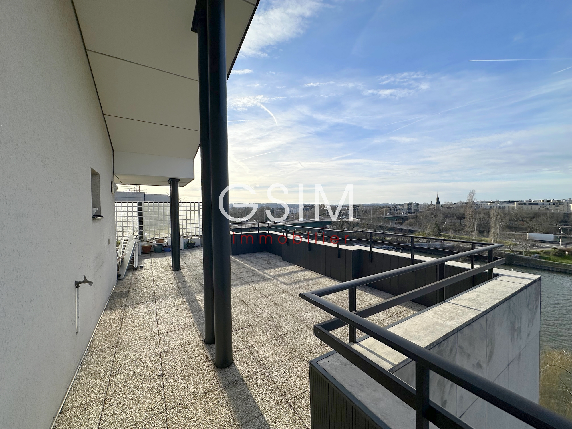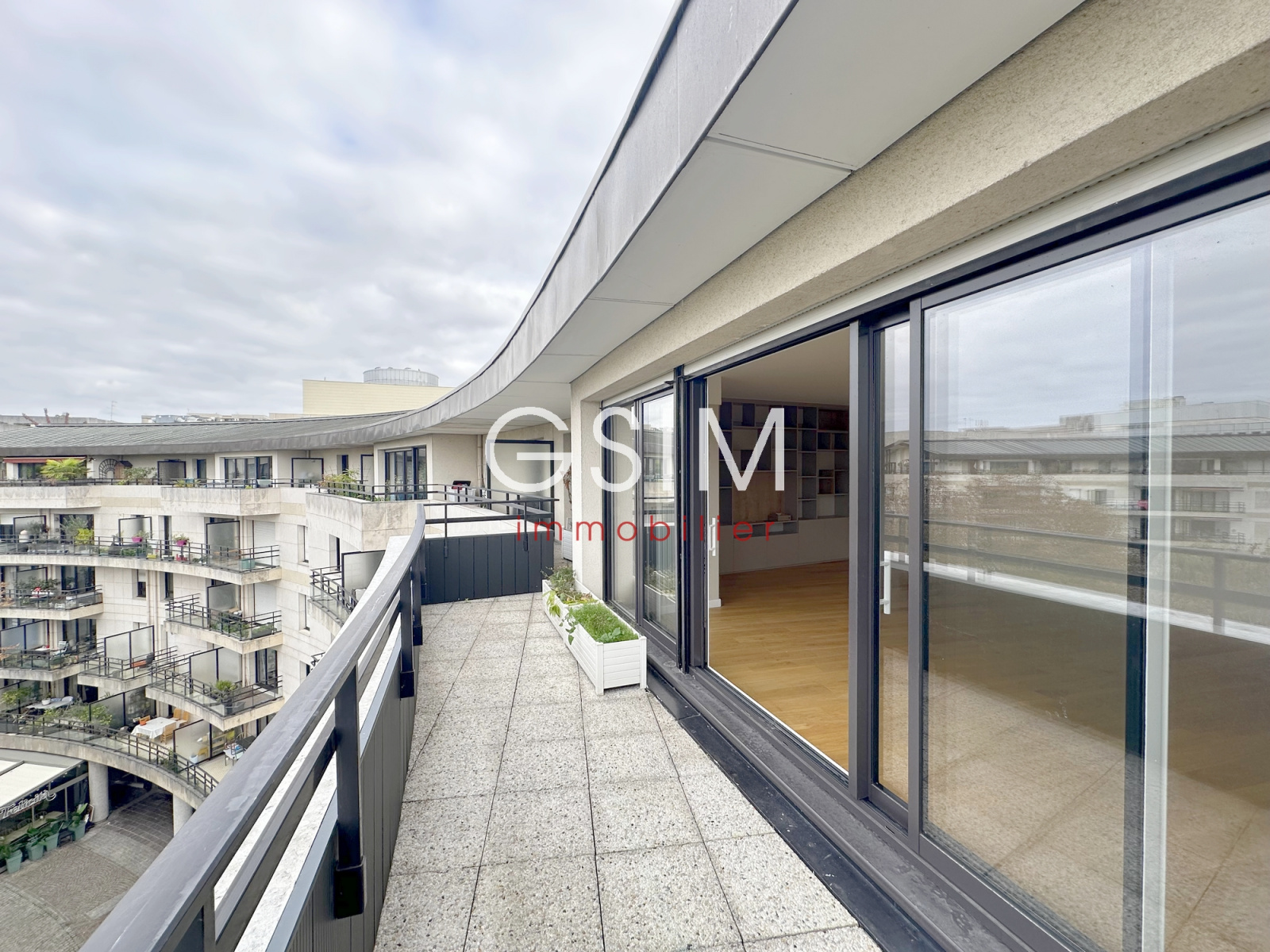 Place des Impressionnistes, au dernier étage avec Terrasses (vue sur la Seine, l'île des Impressionnistes, et le pont de Chatou), très bel appartement entièrement refait de 113 m² se composant : d'une entrée avec penderies, d'un séjour double de 43 m², d'une cuisine US équipée, d'une chambre avec salle de bains avec baignoire et douche, d'une chambre avec penderie et salle de douches, d'une troisième chambre avec salle de douches. Une cave et un parking sous-sol. Fibre.