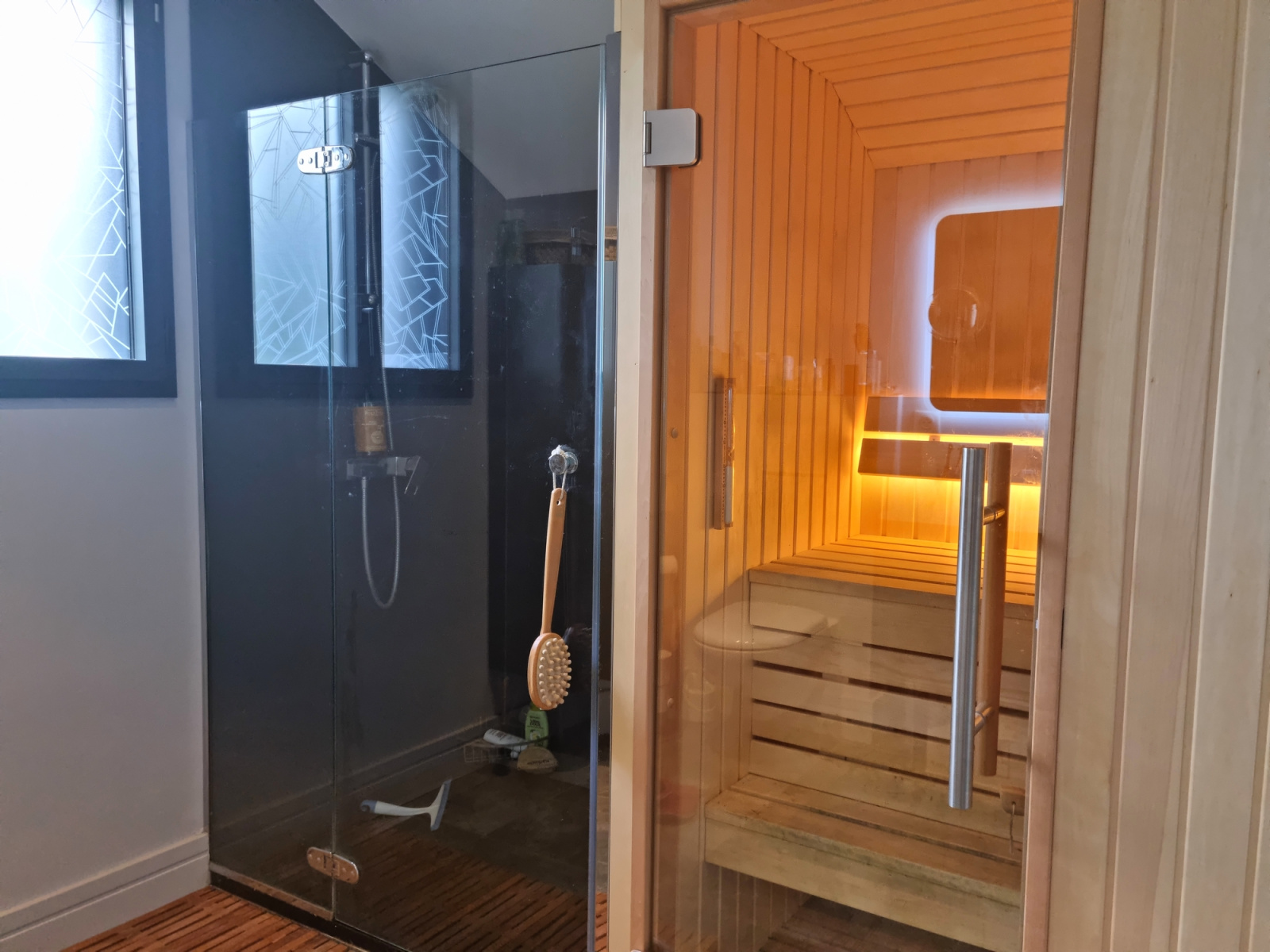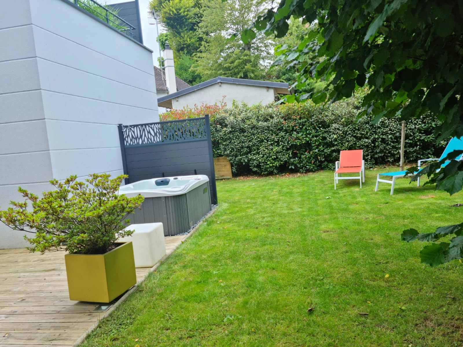 Pièce traversante d’environ 80m2 et ouvertes sur 2 terrasses exposées sud et nord avec un Jacuzzi. Une buanderie attenante et un garage fermé.