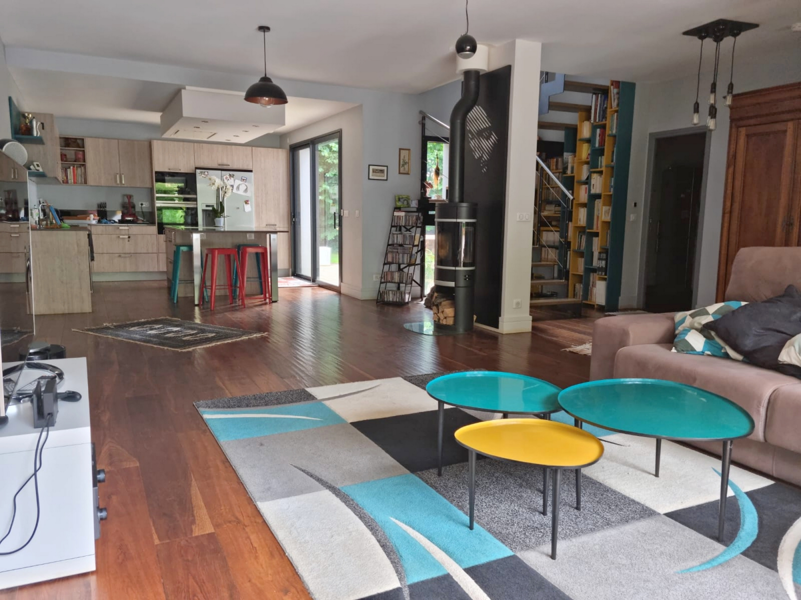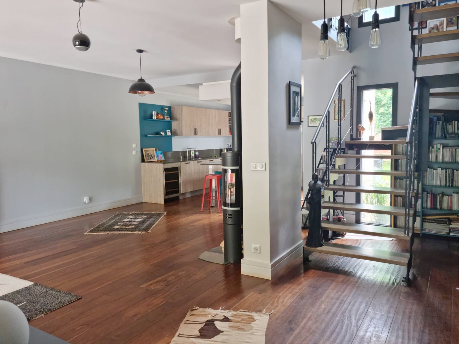Au rez-de-chaussée une entrée avec un vestiaire et WC invités donnant accès à une grande pièce de vie et une cuisine ouverte et équipée.
