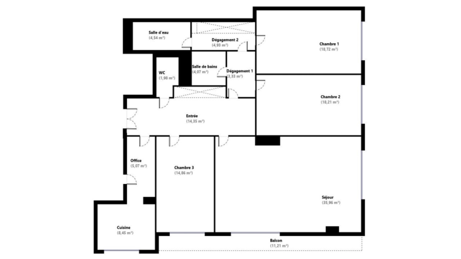 Puis Un couloir desservant également 2 chambres de 18m2 chacune et 2 salles d’eau.
