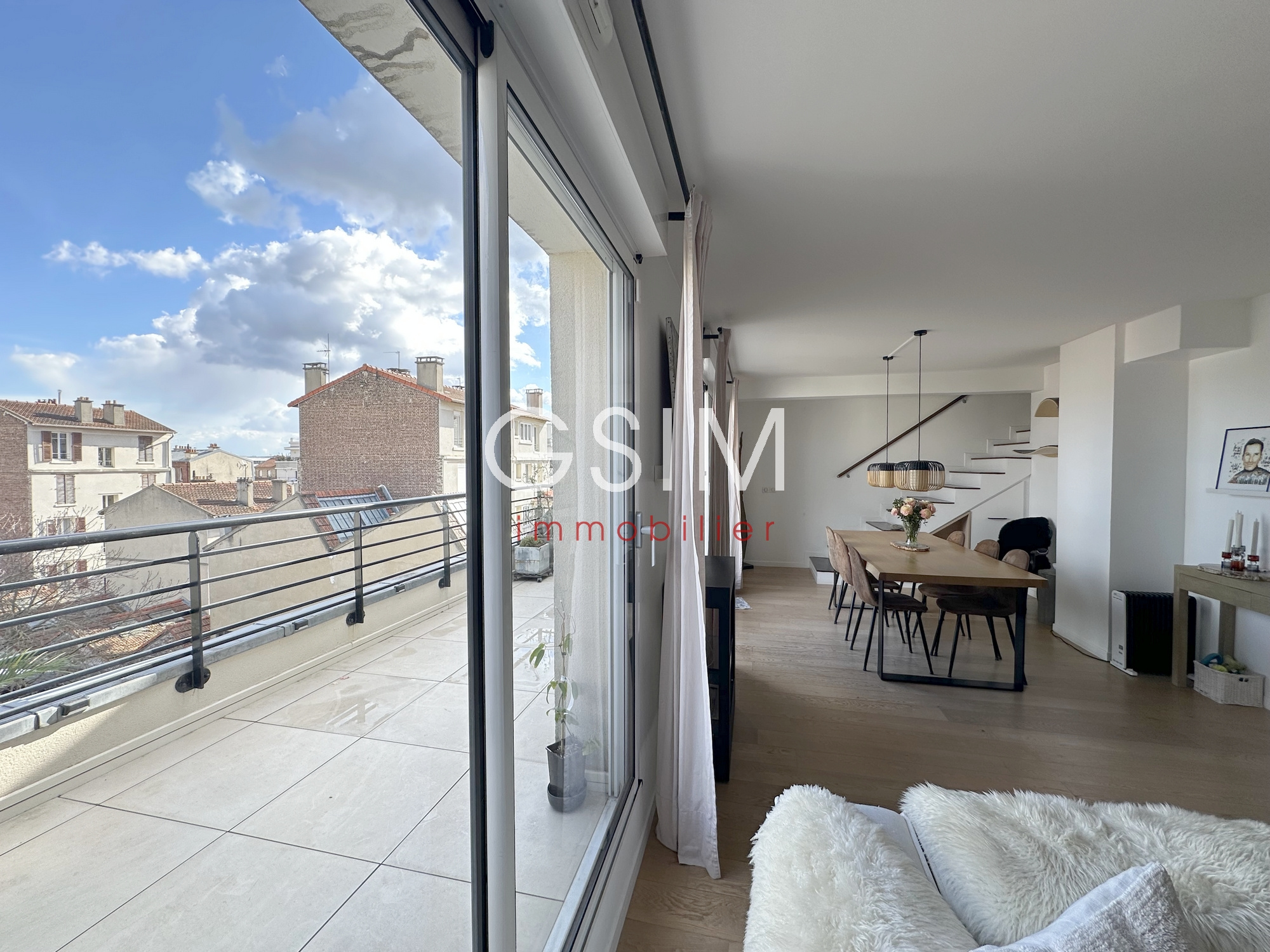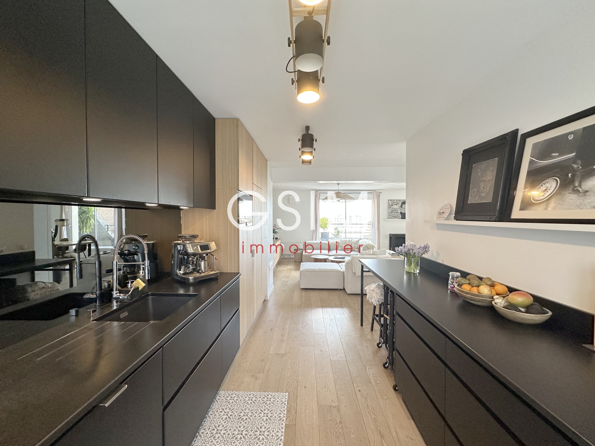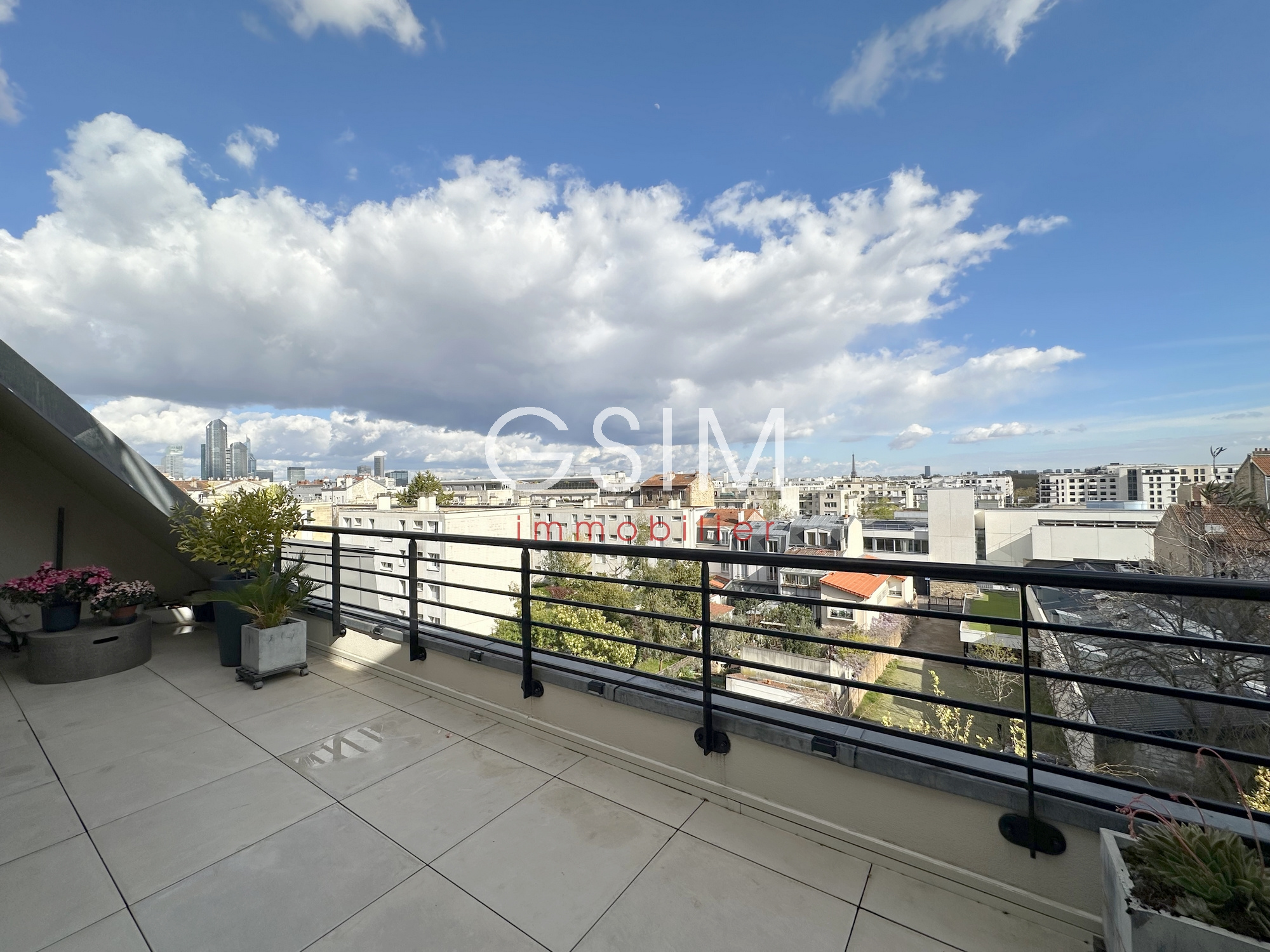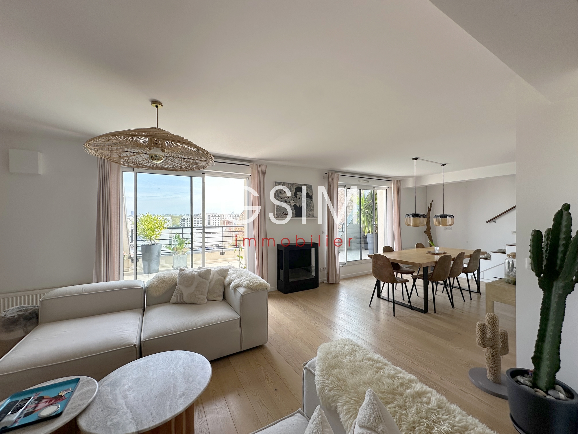 Proche des Ecoles, des commerces, et des transports, au dernier étage d'un immeuble de standing récent (2017), magnifique appartement familial de 139 m² en duplex avec terrasses et vue sur Paris et la tour Eiffel se composant :